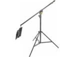 Manfrotto Combi Boom Stand. Extend the second riser of this medium duty black aluminum light stand to its maximum, press a lever, and you have a stand with a two section boom arm. When used as a boom stand, its maximum load is 4.5 lbs (2 kg) — strong enough for a small light fixture with a small softbox or umbrella. A sandbag counterweight is supplied (empty) and recommended whenever boom is extended.