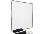 The Manfrotto Pro Scrim All In One Kit 2.9×2.9m Extra Large includes: 1x lightweight frame, 2x textile covers; (black and 1.25 stop diffuser), 2x grip heads, 2x ears and carry case.