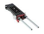 The shoulder pad secures on by touch fasteners. The tripod mount threads are located underneath the shoulder pad. One pair of 15 mm 8″ rods are included for the front. For attaching a matte-box and other accessories, the rod adapter can be adjusted vertically if you remove the screw holding it in position. This baseplate also supports optional SHAPE 15 mm Studio and 19 mm Studio adapters in place of the included one. The baseplate features three camera mount slots, all supporting 1/4″-20 and 3/8″-16 screws. The off-center slots allow you to mount your camera offset if you use a 15 mm Studio Adapter. Multiple 1/4″-20 and 3/8″-16 mounting threads are peppered behind the three slots for attaching articulating arms and other accessories. Two 1/4″-20 and two 3/8″-16 camera mount screws are included.