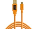 Tether Tools TetherPro USB 2.0 A Male to Micro-B 5-Pin Cable (15′, Orange) connects to cameras, using a micro B 5-pin port. Its gold-plated connectors for corrosion resistance ensure consistent and reliable conductivity. The cable also features a reinforced ferrite core that filters signal noise and reduces transmission errors. A full-lined shielding protects against external signal interference.